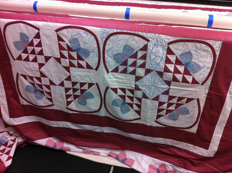Did you see the photos in my last post about the maroon and blue dresden plate with basket blocks? This is Kathy’s quilt and she wanted it custom quilted.