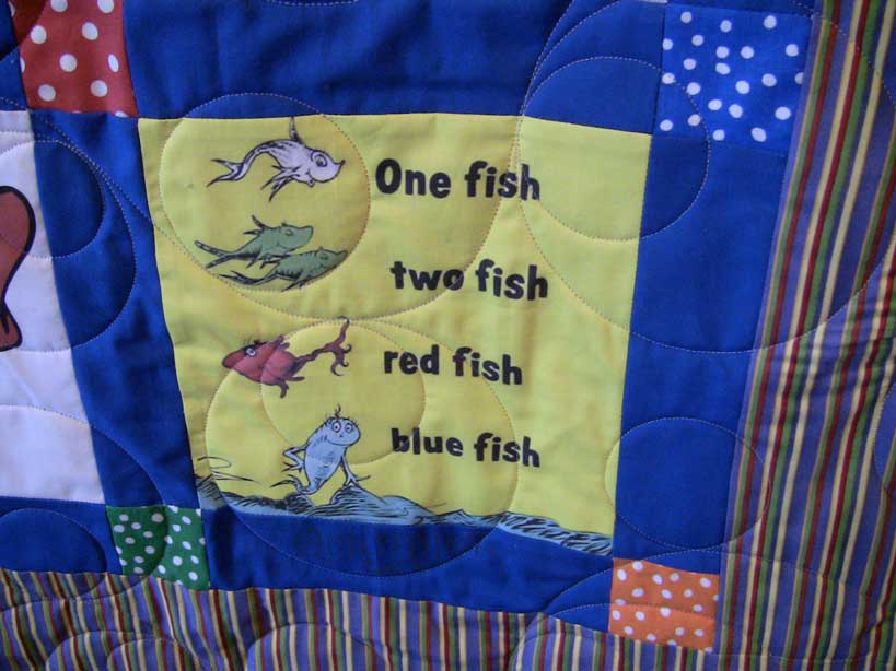 Believe it or not I have a sweatshirt with One Fish, Two Fish embroidered on it. I wore it all the time when my kidlets were small. I think I'd really embarrass them now if I wore it out. They are in the beginning stages of the "Stop it, Mom! Everyone is looking at us weird!" phase.Speaking of angst, this panel of Horton the Elephant always brings up my childhood traumas. My maiden name was Horton and I was teased mercilessly as a child due to this elephant. I can still hear, "Here's comes the elephant! Don't sit on me elephant girl! Horton, where's your egg?"