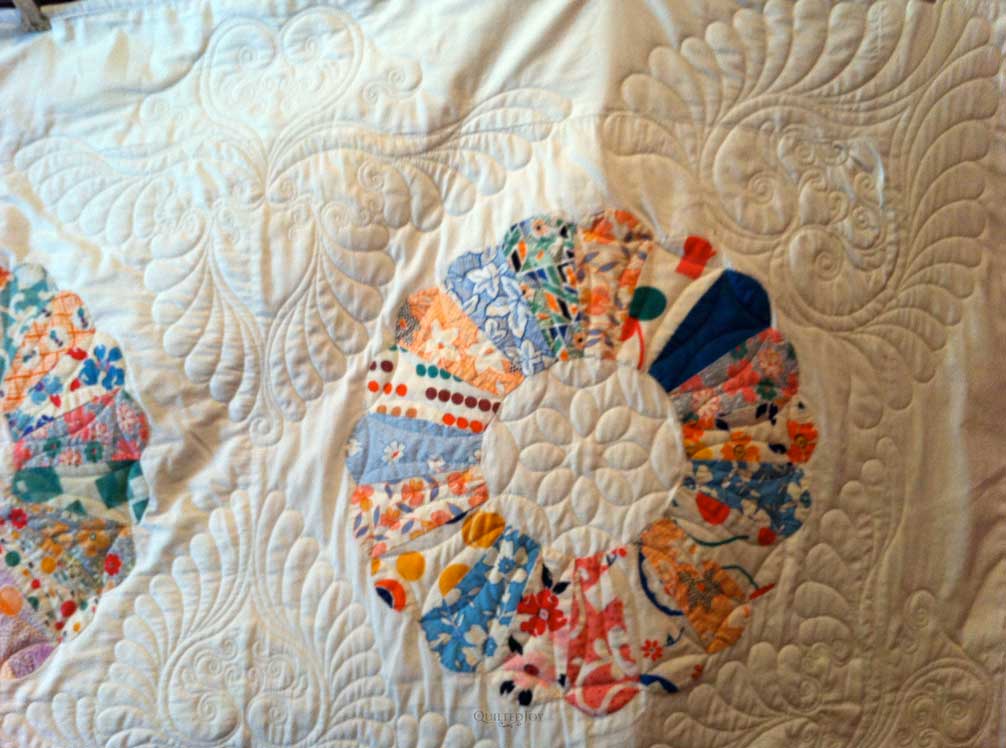 Deciding what to quilt inside each of the Dresden plates. Each plate was a difficult size. Most were not circular so I needed to select a motif that wouldn't drawn your eye to the fact that some were round and some were oblong.
