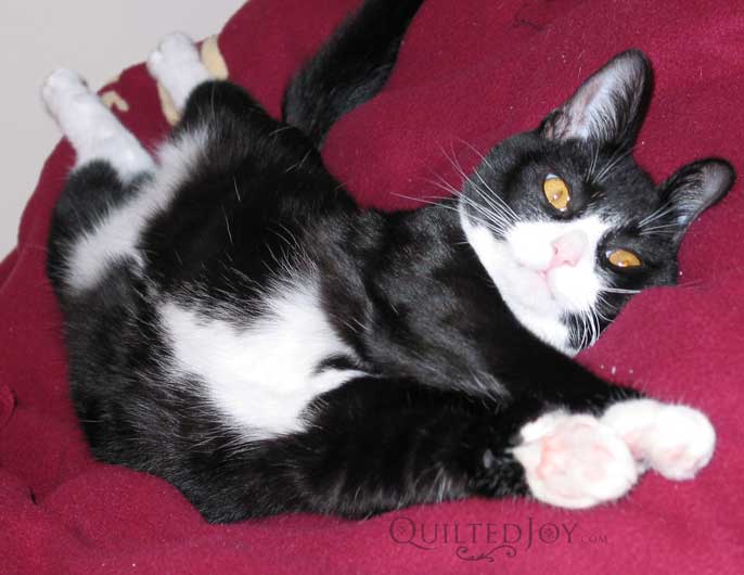 Here are some "Love my tummy" photos of our little Oskar Kitty. He is solid black except for his tummy and socks. My kidlets say he has his tighty whities on. :) Just don't try to touch that tummy for too long because it is being guarded by talons and fangs.