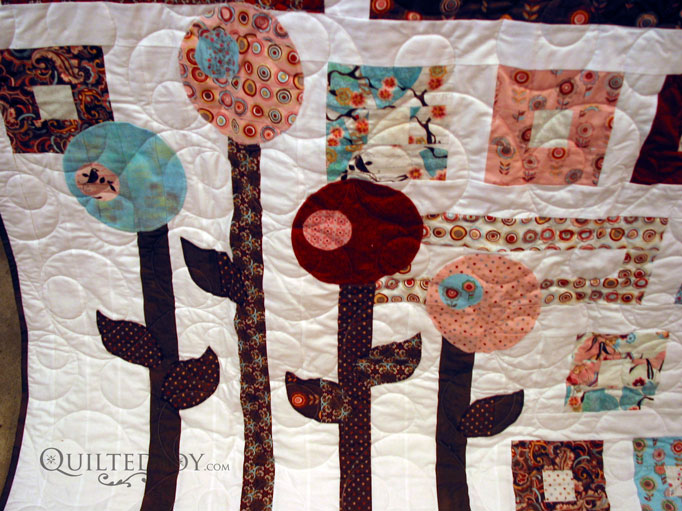 Jill brought me this quilt in great contemporary fabrics. Through the piecing and applique she combined the circles and rectangles to make a visually rich top.