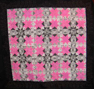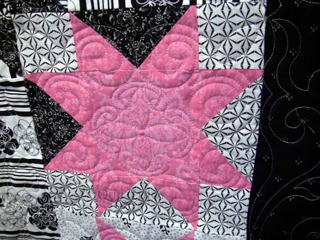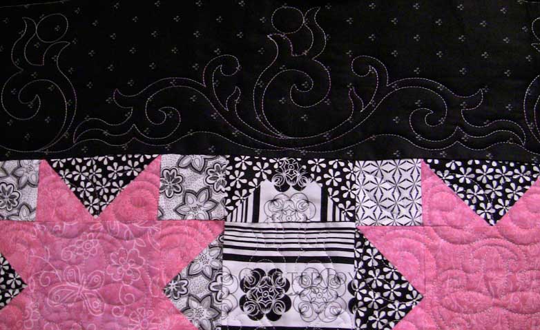 Karen wanted a hot pink variegated thread and I used a beautiful Superior Rainbows' thread that is skinny and catches the light beautifully.Choosing a motif for the border and corners took me a while but I love this set of designs. It is modern and reflects the motifs found in the fabrics. The Rainbows thread works great on the black outer border. It is a small thread that doesn't overpower the fabrics.