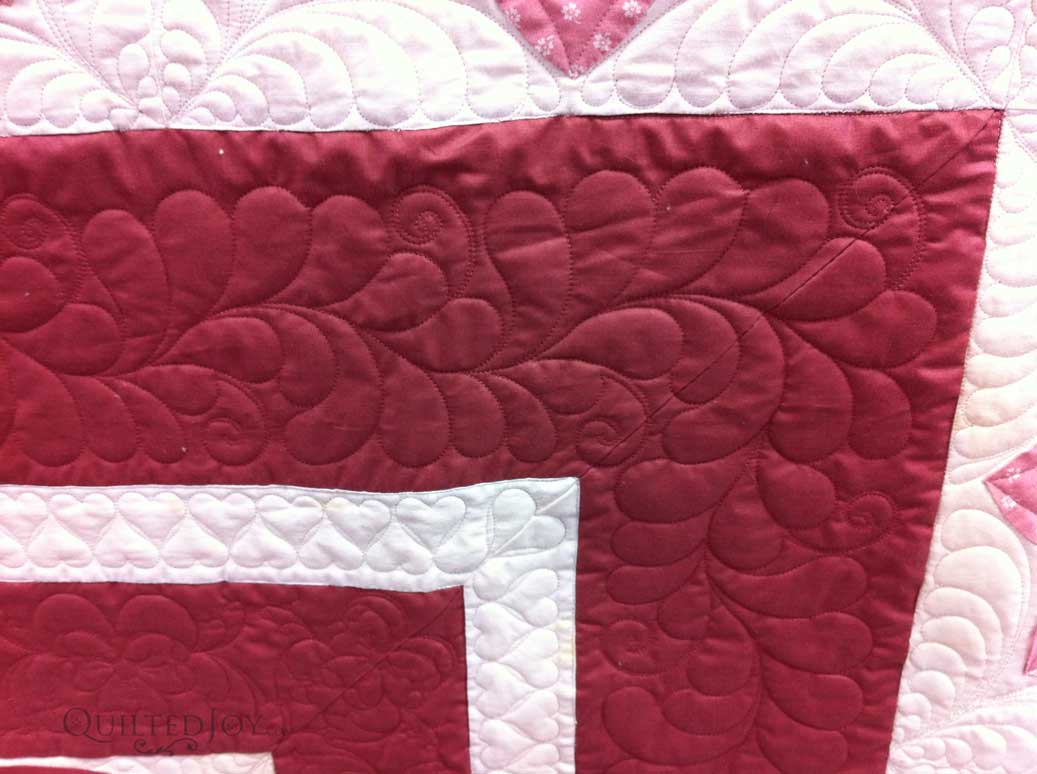 In the skinny white border I added a double heart design which I picked up in the inner maroon border with a ribbon flower in which the ribbons mimic the hearts.