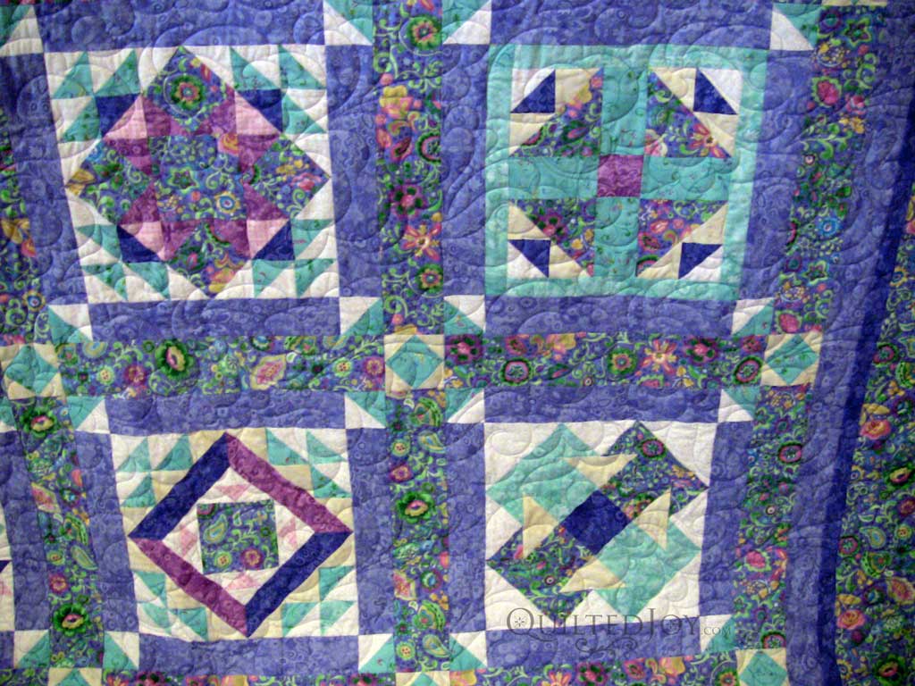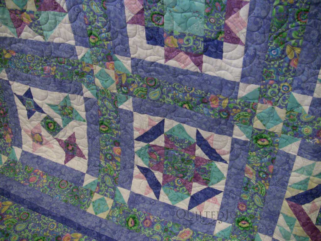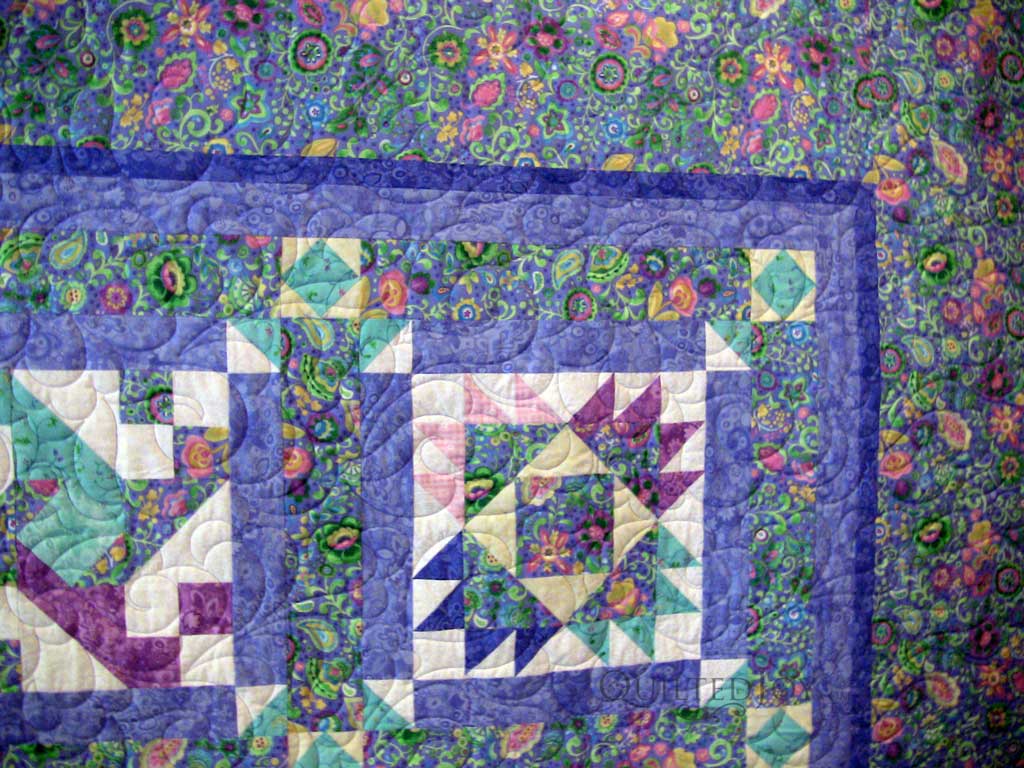 Terry chose the edge to edge pantograph, Cascade, for this quilt and the texture it gives to those beautiful purples, greens and blues is wonderful.