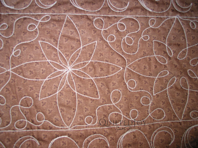 In the pinwheels I used her piecing to guide the quilting so it was completely a no marking project. There are two different pinwheels in this top so I quilted them two different ways. You can see it best from the back. This quilt is really more like a reversible quilt as it has a dark brown backing and I used white thread. The backing is really beautiful.