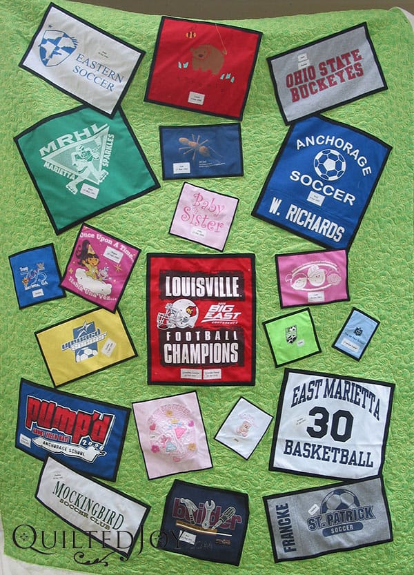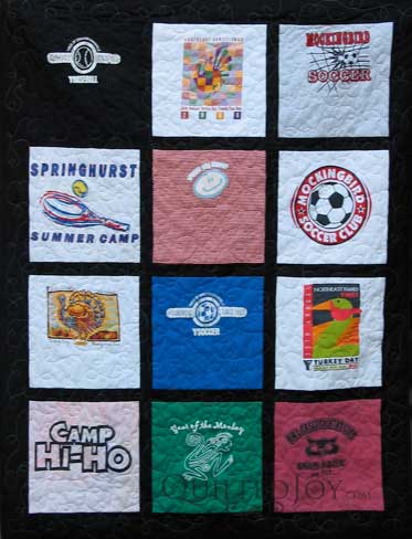 Lisa's t-shirt quilt is done! This quilt is made up of her son's many sports shirts. The focus block, however,...