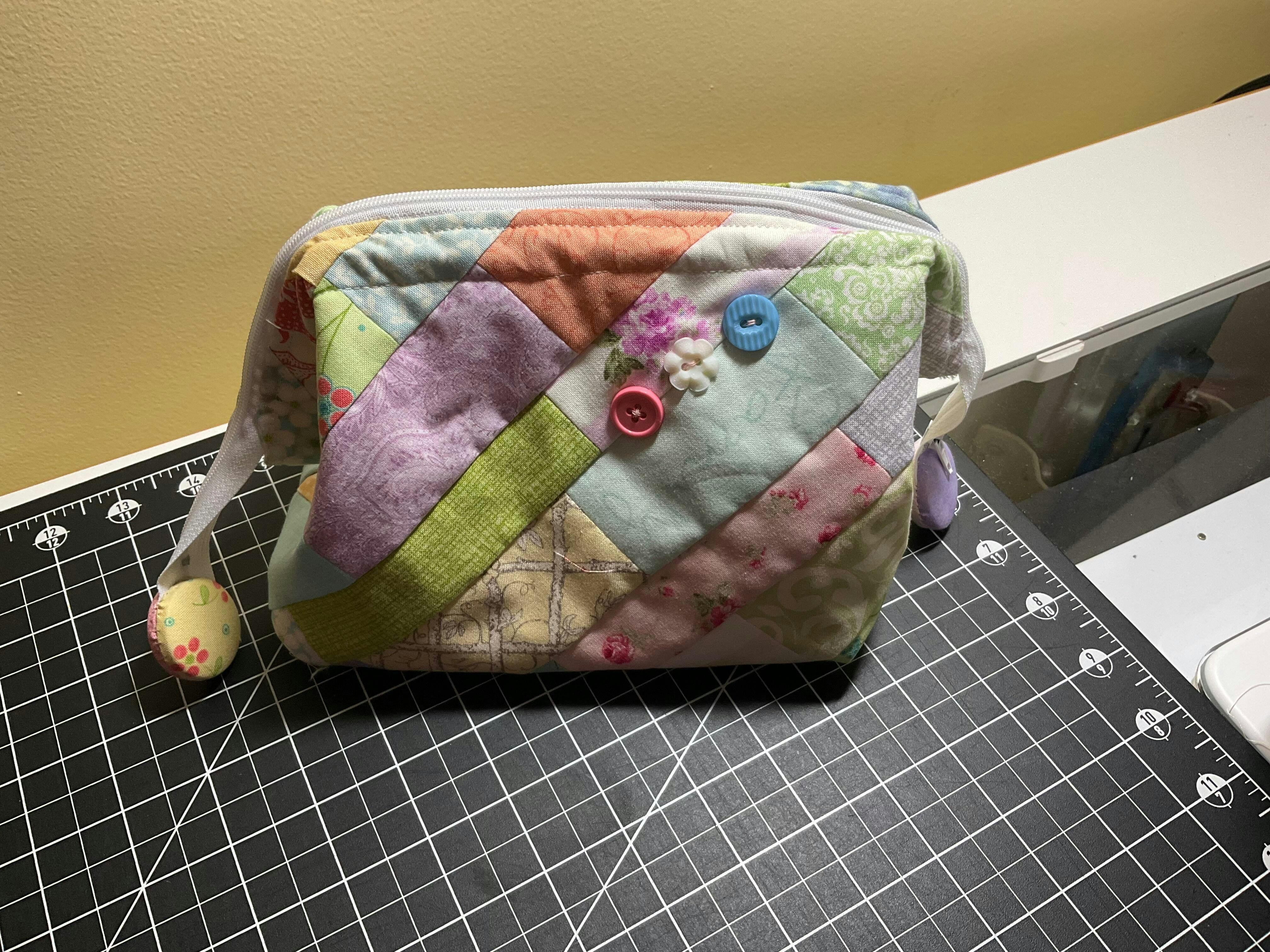 This Cute As A Button Bag is all about the details: playful patchwork, cute cover buttons, zipper tabs, and a handy internal wire frame that allows the mouth of the bag to open wide. This adorable carryall is perfect for storing cosmetics, sewing supplies and more! Kit includes: pattern, internal wire frame set, one 16in zipper, and four cover buttons. Finished size is 8in wide x 6.25in tall x 4.75in deep (20 cm wide x 16 cm tall x 12 cm deep).