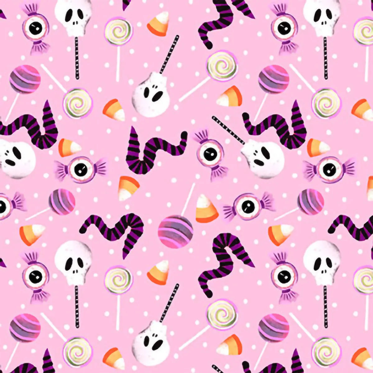 The Ghostly Greetings Pink Halloween Candy Fabric Yardage from the Ghostly Greetings collection by Rose Halsey for Blank Quilting is filled with colorful Halloween sweets and candies on a pink base—perfect for treat bags, quilts, or spooky-sweet sewing crafts.