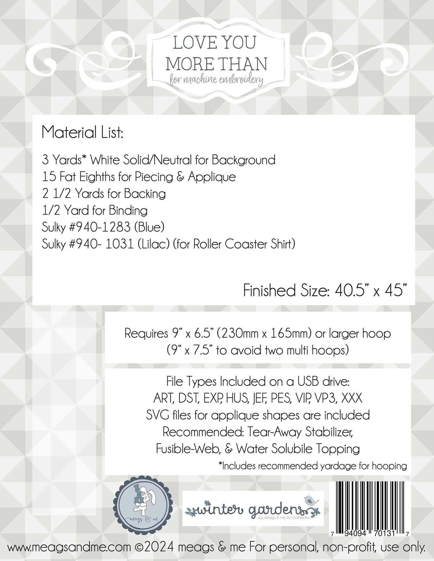 This charming and heartfelt quilt pattern, Love You More Than, quilt pattern is designed by Meags & Me and is specifically created for machine embroidery and includes both a USB drive and a PDF pattern.