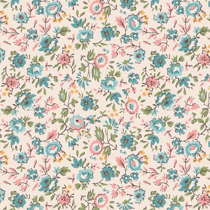 Piece and Plenty Latte Floral 108" Wide Quilt Backing Fabric is a beautiful floral design with small teal and pink flowers on an off-white background, designed by Lori Holt for Riley Blake.