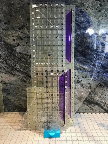 This Blue Ruler Stand will organize your 1/2 in (3mm) quilt rulers. Each ruler stand has 10 slots and measures approximately 4.25in long (including tabs) and is 3in wide. Non-slip feet on the bottom keep your ruler stand in place. We include tabs on the front and back to make it easy to move the ruler stand when it is loaded with rulers. The tabs are made to fit together perfectly so you can place multiple ruler stands in a row and minimize the space needed. Designed and manufactured in the USA by Purple Hobbies LLC.